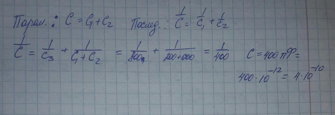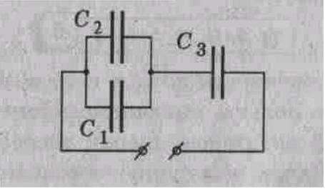 Задача: Найдите емкость цепи, изображенной на рисунке, если C1 = 200 пФ, C2 = 600 пФ и C3 = 800 пФ?