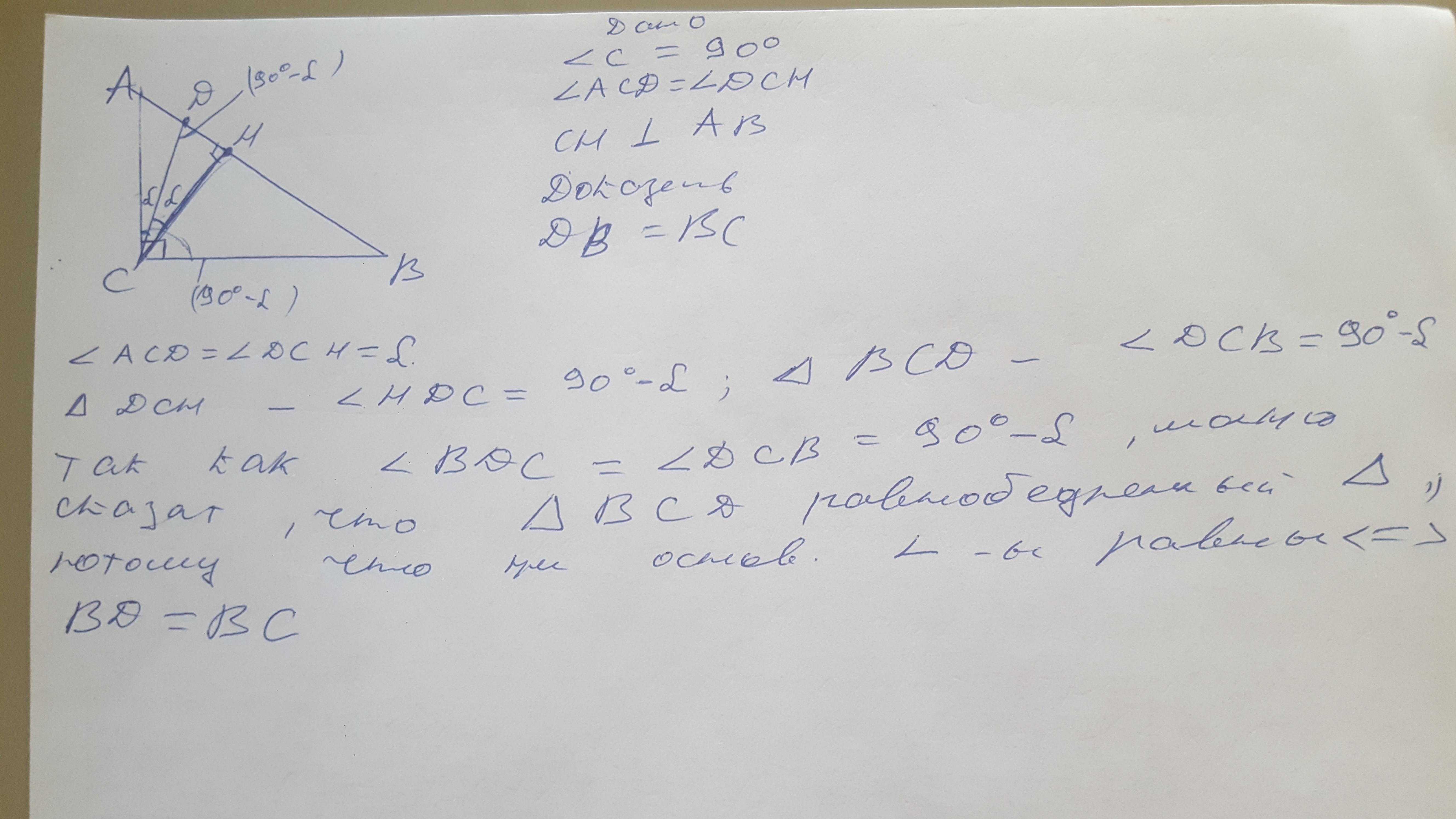 ДАЮ 25 БАЛЛОВ В прямоугольном треугольнике ABC с гипотенузой AB проведена высота CH, отрезок CD — биссектриса треугольника ACH. Докажите, что BD=BC