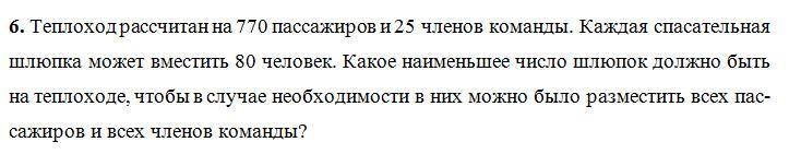 Пошаговое объяснение:Общее число людей на корабле 770+25=795. Мы знаем, что шлюпка вмещает 80 человек, значит поделим 795 на 80 получим 9 и ост. 75. Значит нужно 9+1=10 шлюпок.