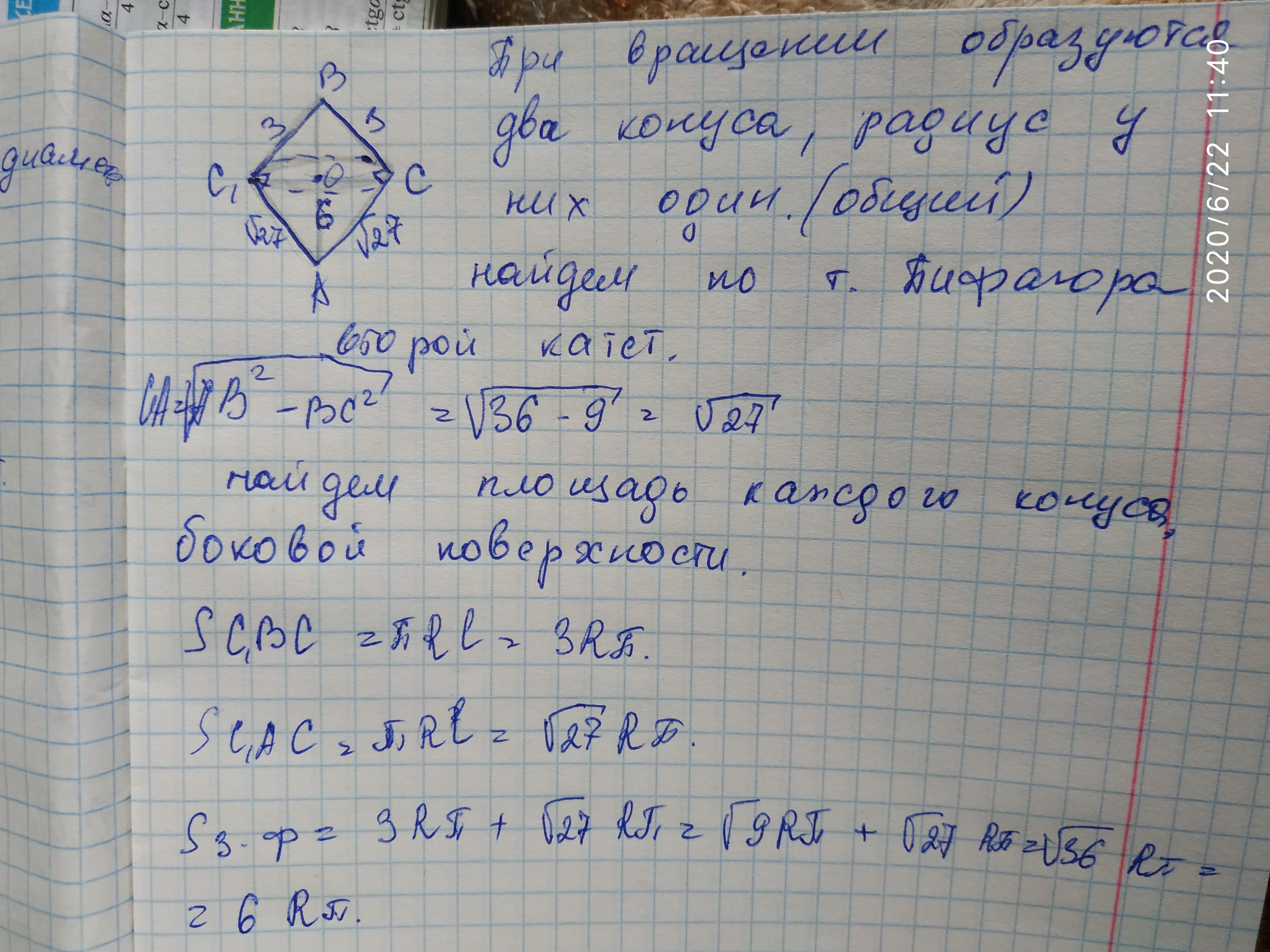Помогите решить. Прямоугольный треугольник с катетом 3 см и гипотенузой 6 см вращается вокруг гипотенузы. Найдите площадь поверхности полученного тела вращения.