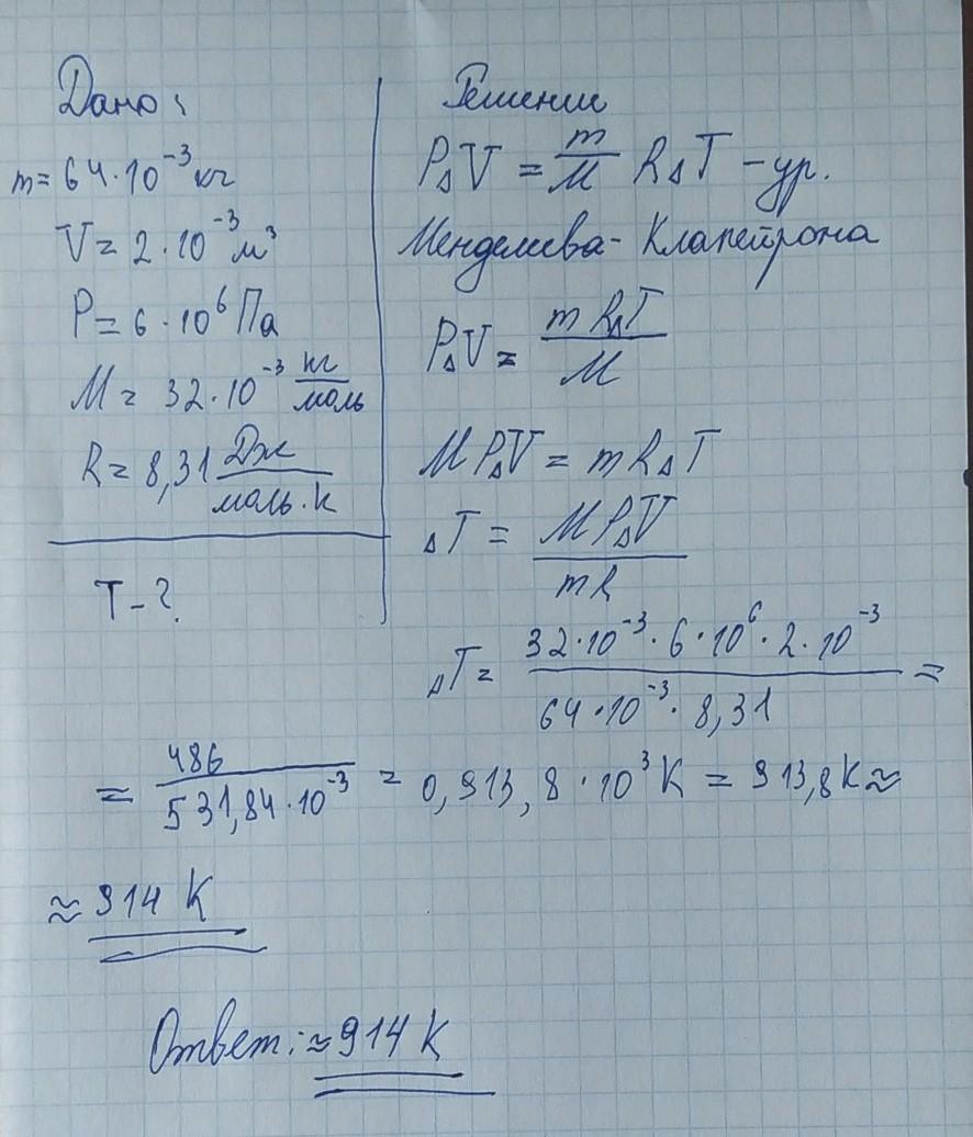 Определите температуру кислорода массой 64 г, находящегося в сосуде объёмом 2 л при давлении 6 • 10^6Па. Молярная масса кислорода М = 0,032 кг/моль. (R = 8,31 Дж/(моль • К)) C решением пожалуйста.Отдам все свои баллы