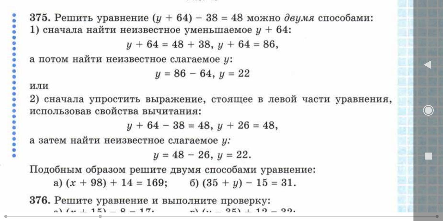 "X" в одну сторону , известные числа - в другую(при переносе чисел из одной стороны в другую мы меняем их знаки на противоположные. Т.е было х + 98 = 155, мы перенесли +98 в правую часть и получили x = 155 - 98), подсчитываем: