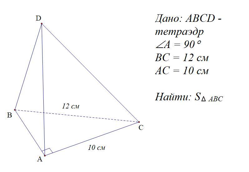 В основании тетраэдра прямоугольный треугольник, гипотенуза которого равна 12 см. Один из катетов имеет длину 10 см. Найти площадь основания тетраэдра.