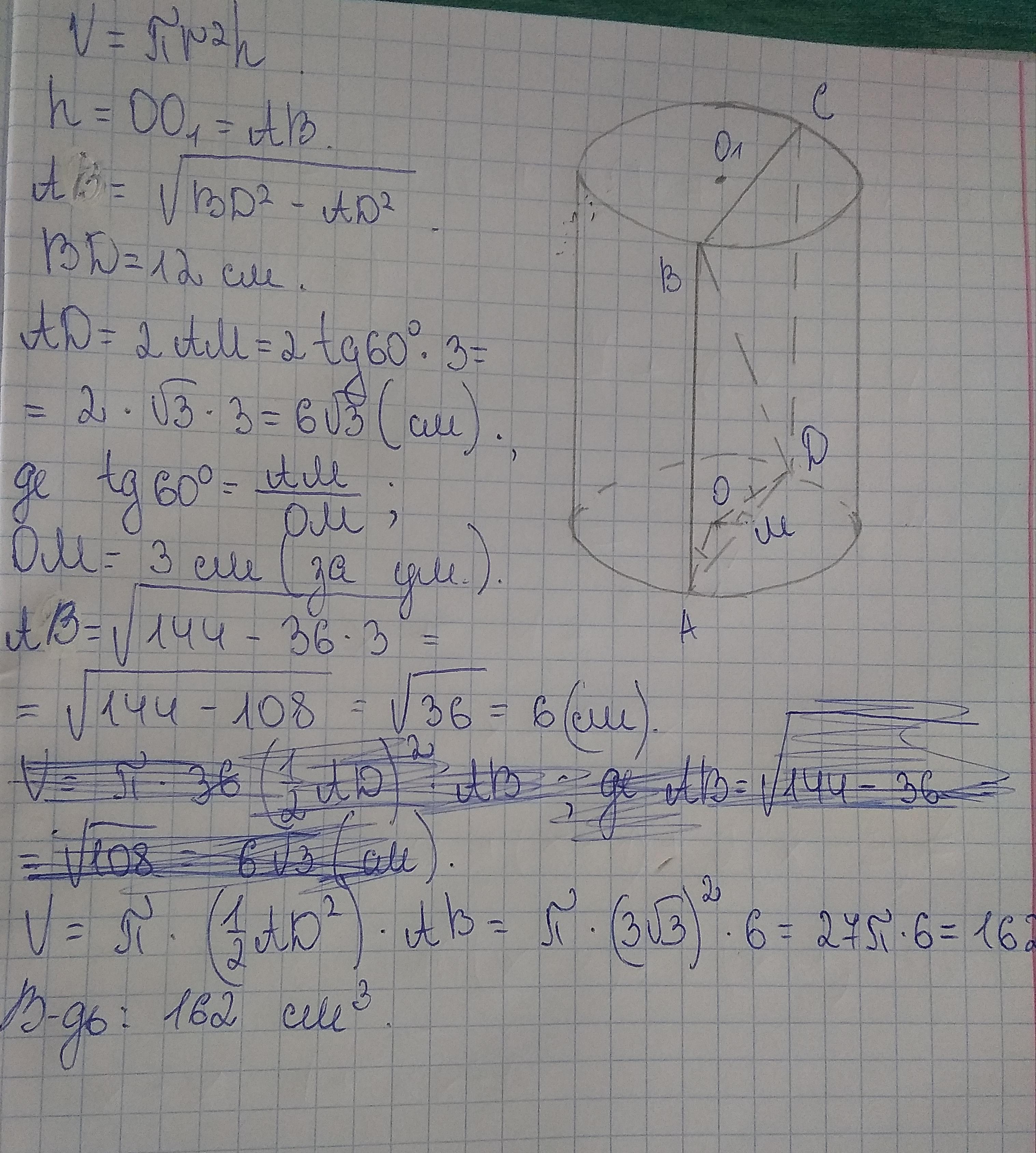 паралельно осі циліндра проведено переріз, що відтинає від кола основи дугу, градусна міра якої дорівнює 120 градусів, і віддалений від осі цциліндра на 3 см. знайти об"єм циліндра, якщо діагональ отриманого перерізу дорівнює 12 см.
