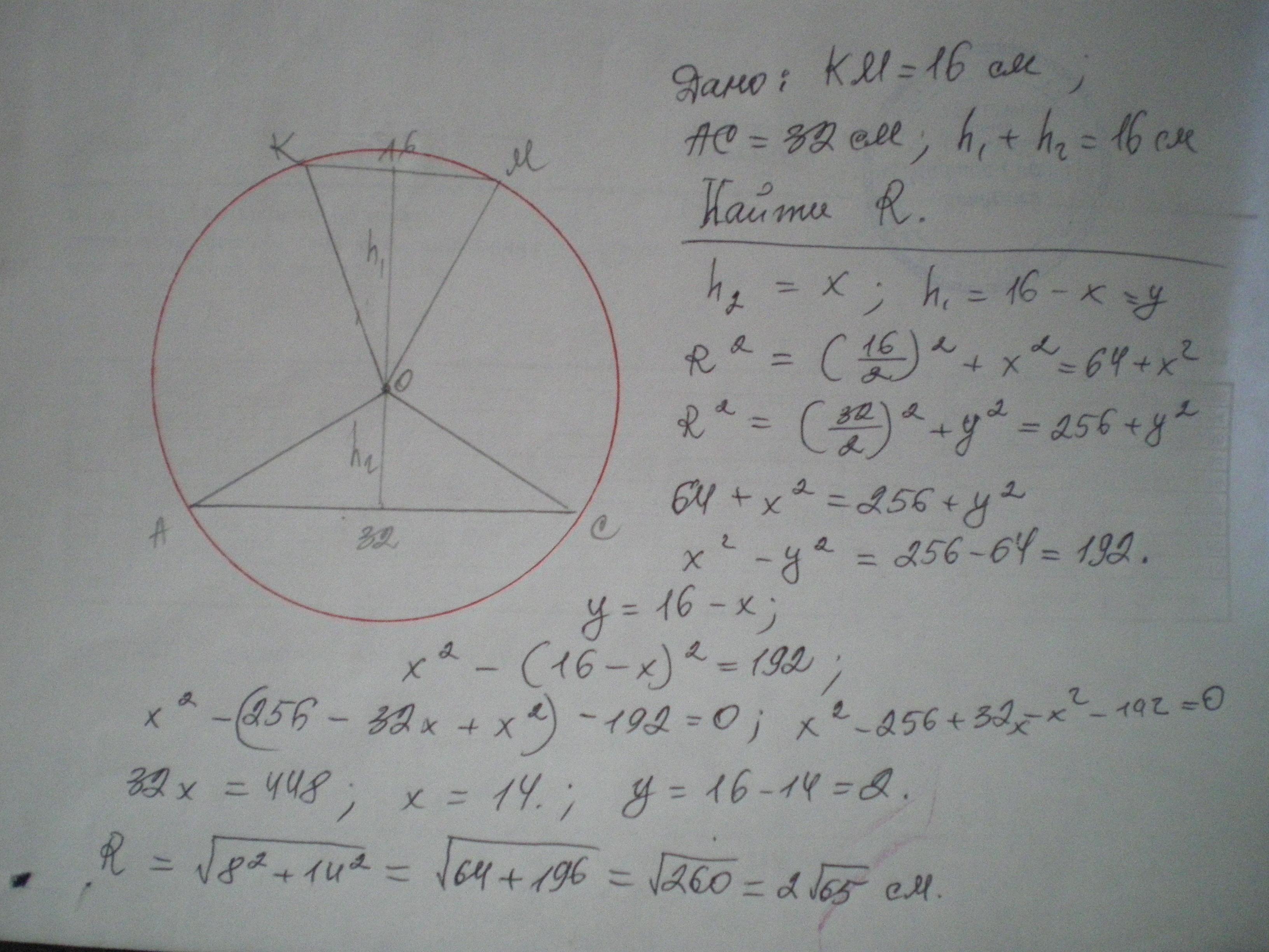 у колі по різні сторони від його центра проведено Дві паралельні хорди завдовжки 16 см і 32 см. відстань між хордами дорівнює 16 см Знайдіть радіус кола
