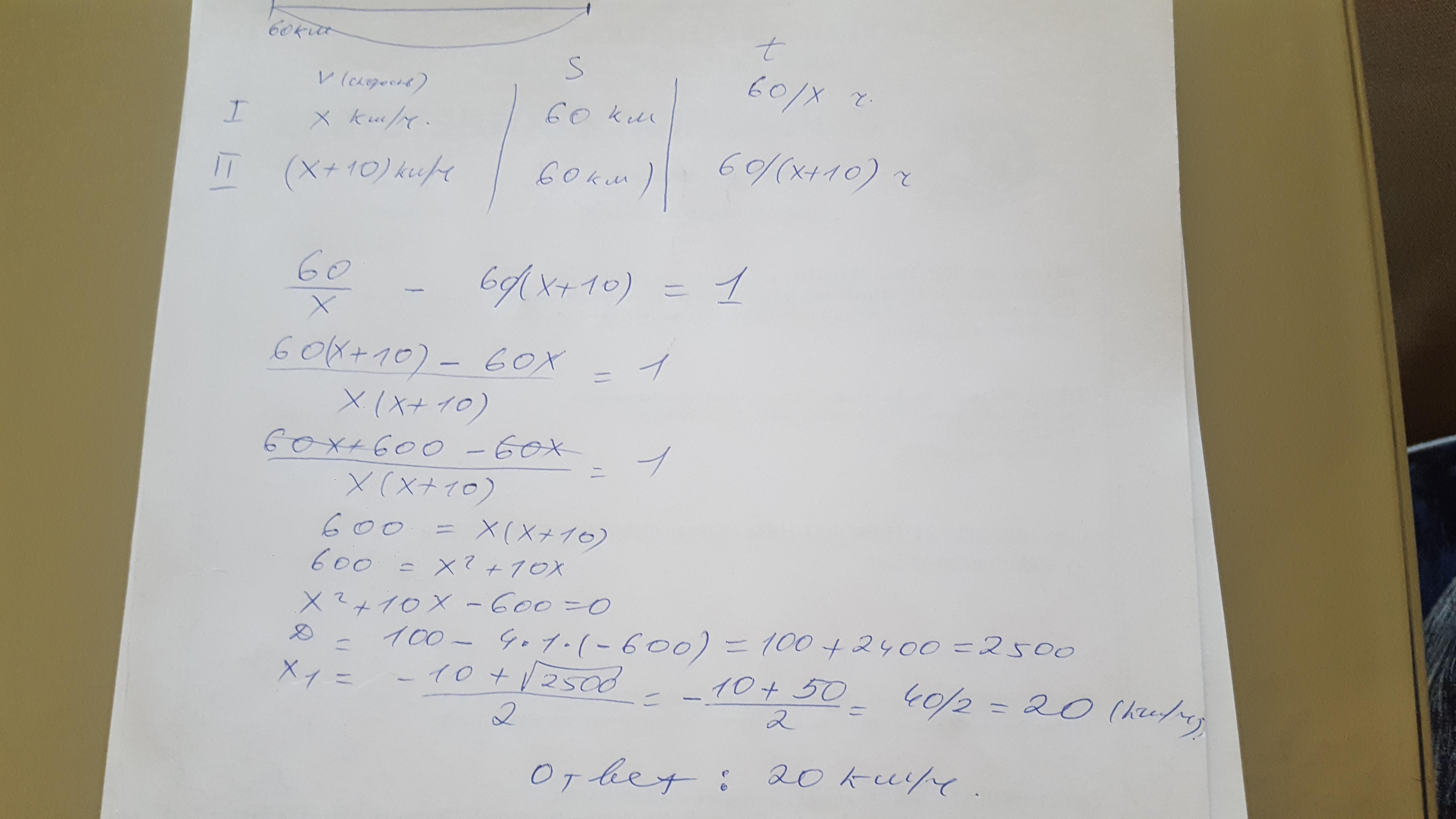Мотоциклист ехал с постоянной скоростью 60 км. Если бы он пошел на 10 км / ч быстрее, он бы сократил время в пути на один час. Найдите скорость мотоциклиста.