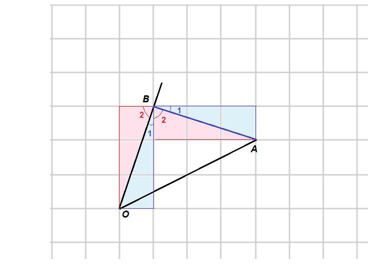 Отрезки ОВ и АВ являются диагоналями равных прямоугольников со сторонами 3 и 1, значит, ОВ = АВ.