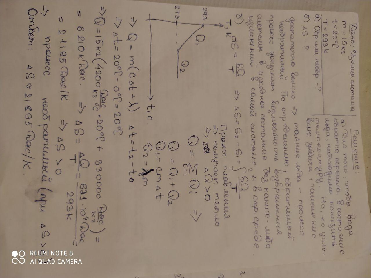 15-килограммовая глыба льда при таянии превращается в воду внутри большой комнаты с температурой 20оС. Рассматривайте лед и помещение как изолированную систему и считайте, что помещение достаточно велико, чтобы игнорировать изменение его температуры.
