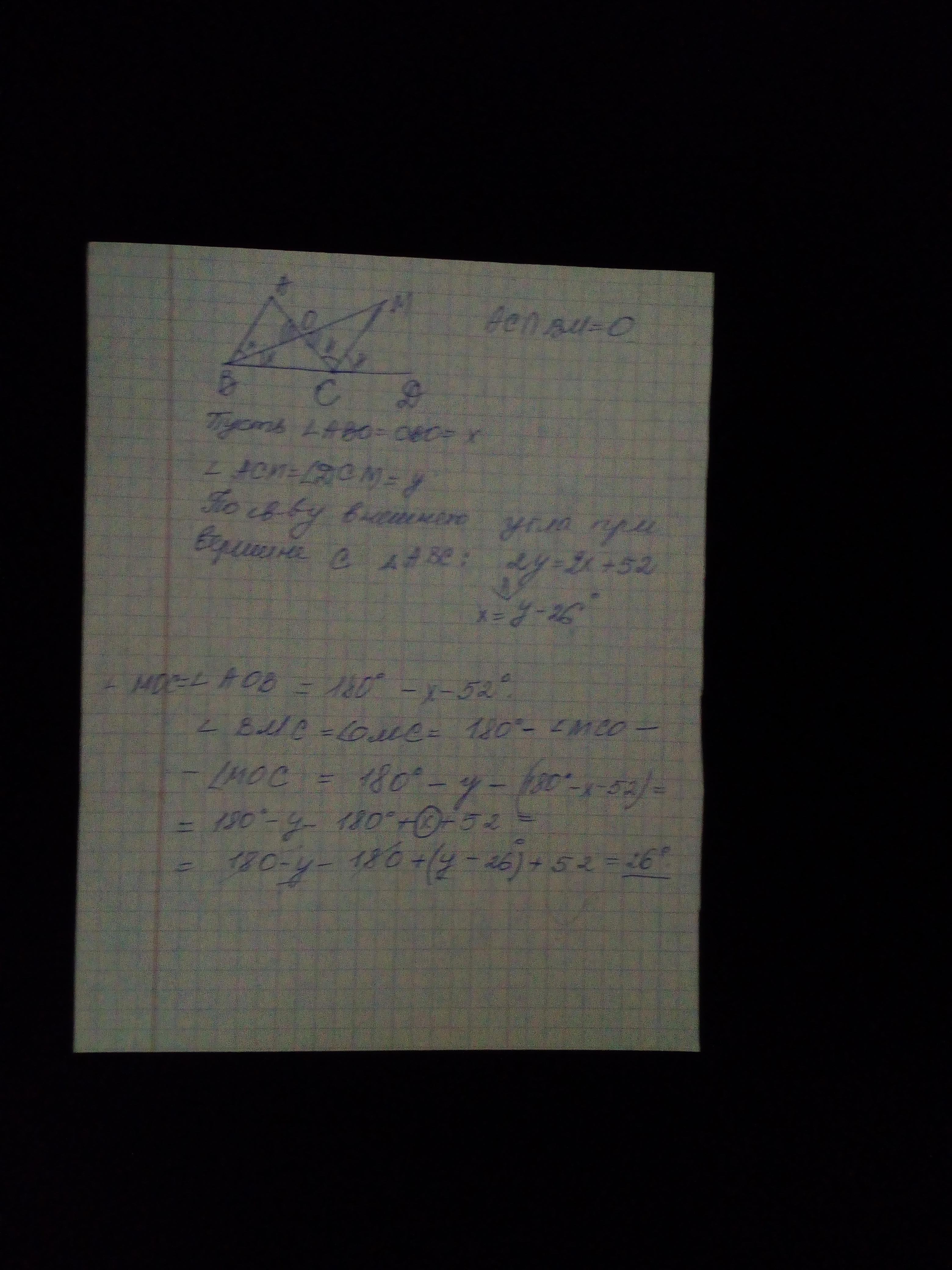 Помогите, пожалуйста) Биссектриса внешнего угла ACD треугольника ABC пересекает биссектрису угла ABC в точке M, угол BAC = 52 градуса. Найдите угол BMC.