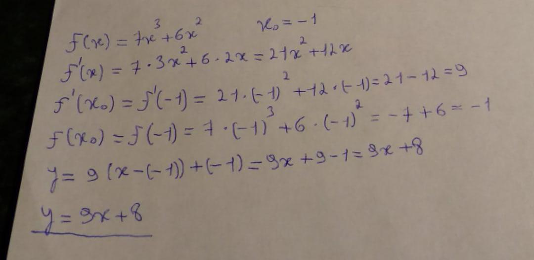 Помогите решить срочно составьте уравнение косательной к функции f(x)=7x^3+6x^2 х0=–1