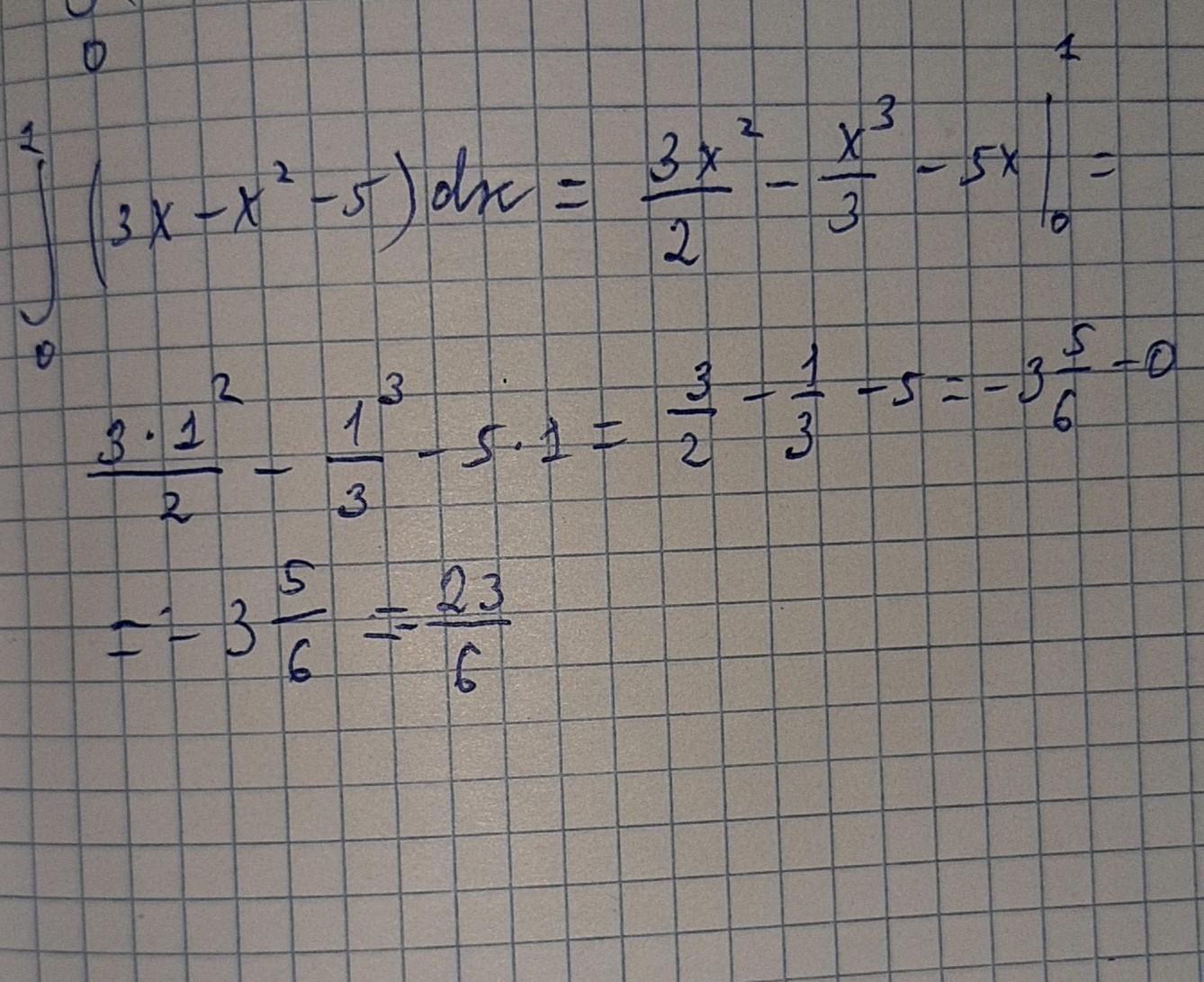 В выражение 3х²/2+х³/3-5х по формуле Ньютона - Лейбница подставим верхний и нижний пределы интегрирования. получим