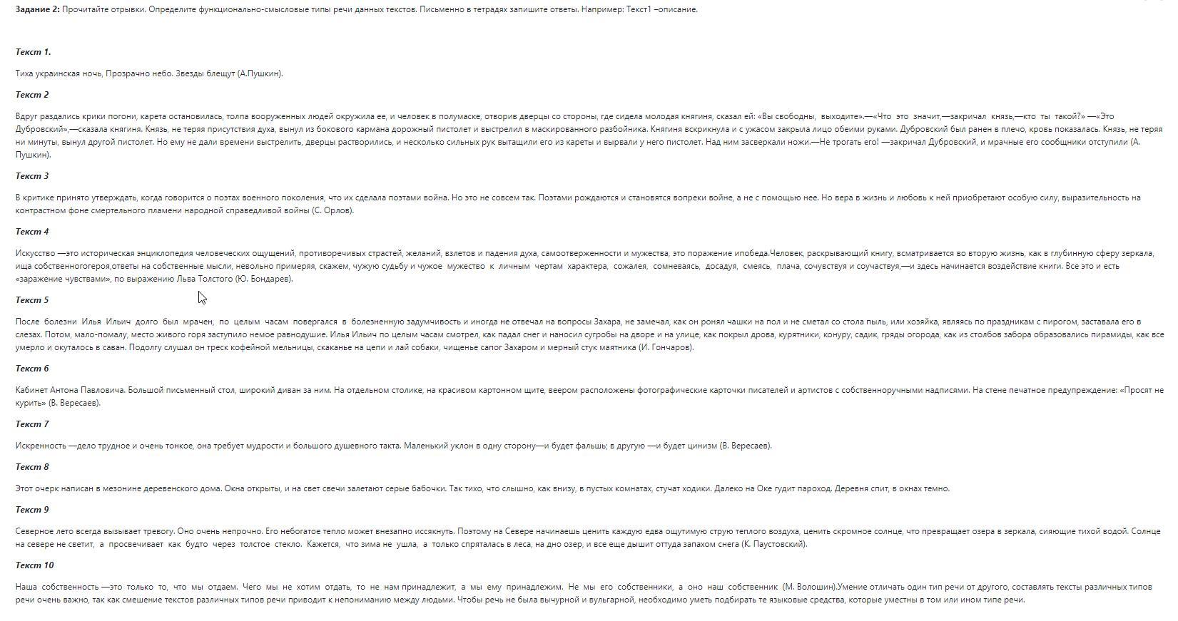 Прочитайте отрывки. Определите функционально-смысловые типы речи данных текстов. Письменно в тетрадях запишите ответы. Например: Текст1 –описание.