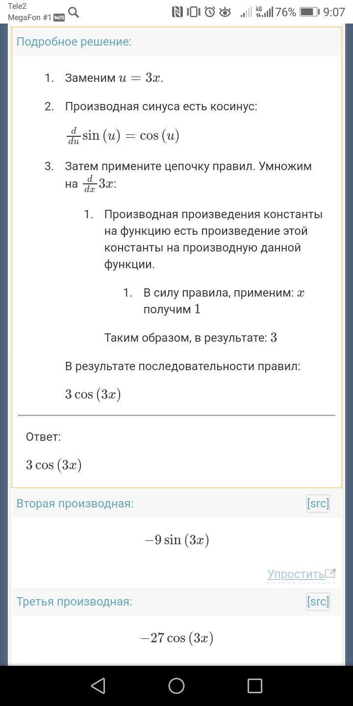 F'(x)= (sin(3x))' = сos(3x) • (3x)' = сos(3x) • 3 = 3cos(3x).