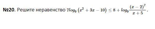 7\, log_9(x^2+3x-10)\leq 8+log_9\dfrac{(x-2)^7}{x+5}\ \ ,\\\\\\ODZ:\ \left\{\begin{array}{l}x^2+3x-10>0\\\frac{(x-2)^7}{x+5}>0\end{array}\right\ \ ,\ \ \left\{\begin{array}{ccc}(x-2)(x+5)>0\\(x-2)^7(x+5)>0\end{array}\right\ ,\\\\x\in (-\infty ;-5\, )\cup (\, 2;+\infty )\\\\ log_9(x^2+3x-10)\leq 8+log_9\dfrac{(x-2)^7}{x+5}\\\\\\ log_9(x-2)^7(x+5)^7-log_9\dfrac{(x-2)^7}{x+5}\leq 8\\\\\\log_9\dfrac{(x-2)^7(x+5)^7}{\frac{(x-2)^7}{x+5}}\leq log_99^8\ \ ,\ \ \ \ \dfrac{(x-2)^7(x+5)^8}{(x-2)^7}\leq 9^8\ \ ,