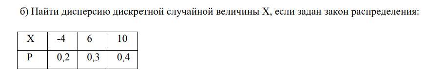 M(X) = - 4 * 0,2 + 6 * 0,3 + 10 * 0,4 = - 0,8 + 1,8 + 4 = 5