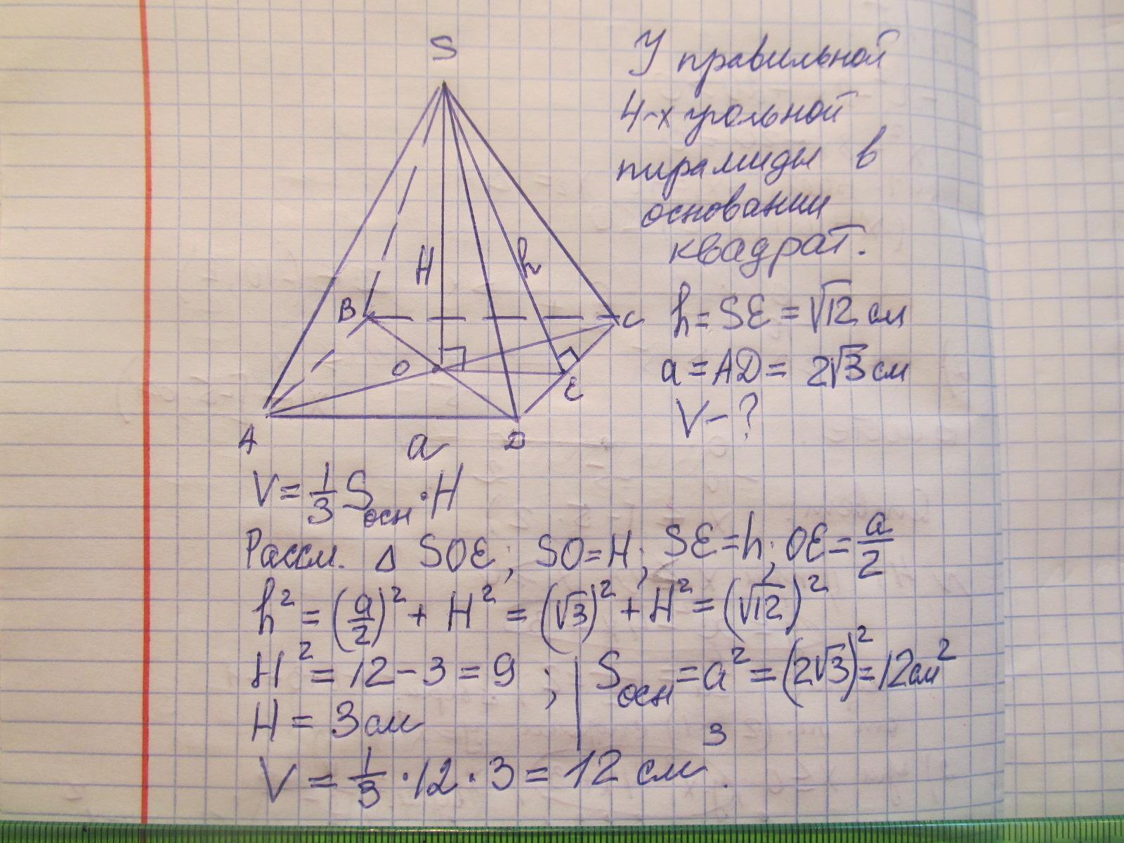 СРОЧНООООО ПОЖАЛУЙСТА!!!!!!!! Апофема правильной четырехугольной пирамиды равна корень из 12см найдите объем пирамиды если длина стороны основания равна 2корень из3 см?