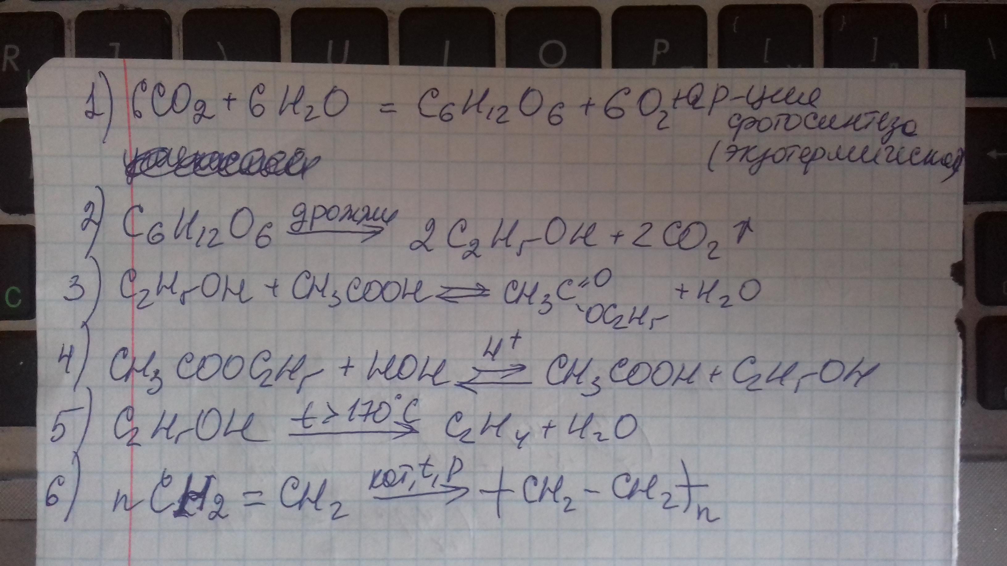 Осуществите следующие превращения. Напишите уравнения реакций, назовите вещества, укажите тип реакций. СО2→С6Н12О6→С2Н5ОН→СН3СОО-С2Н5→С2Н5ОН→С2Н4→(─СН2─СН2─)n Хелп срочно надо