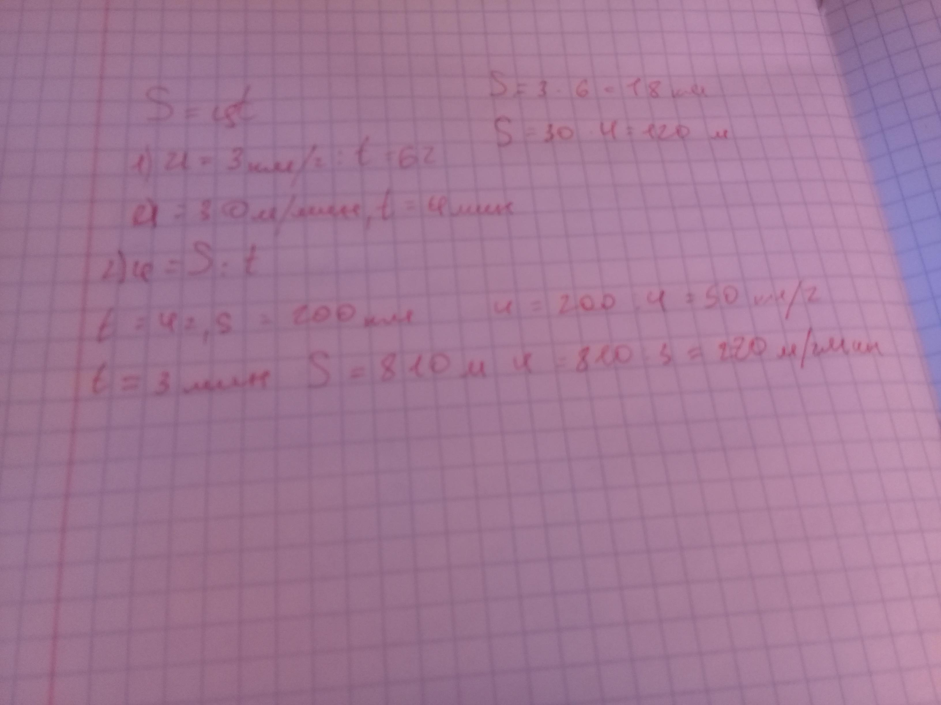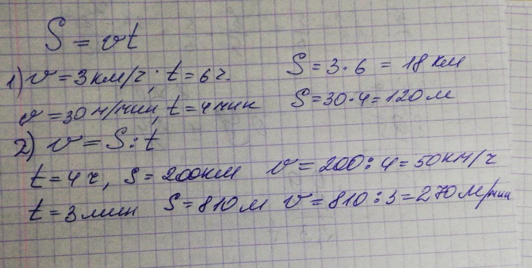 Найди по формуле s=ut путь,если u=3км/ч,t=6ч, u=30м/мин,t=4мин. Найди по формуле s=ut скорость , если t=4ч, s=200км, t=3мин,s=810mм