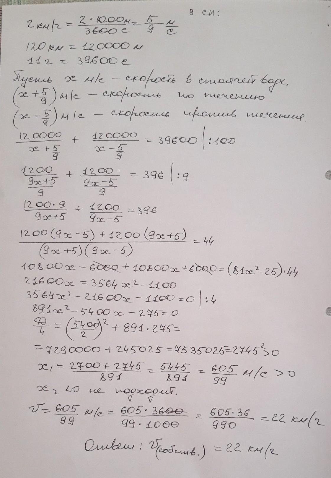 t=S/V, составим уравнение 120/(x+2) + 120/(x-2) =11