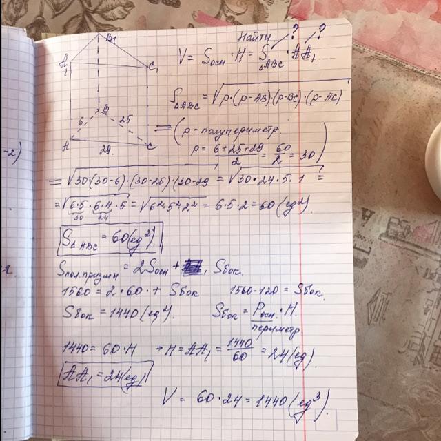 ОТДАЮ ВСЕ ЧТО ЕСТЬ!!!!!!ПОМОГИТЕ!!!!!!В прямоугольной треугольной призме стороны основания равны 6, 25 и 29 см. Площадь полной поверхности равна 1560 см². Вычислите объем призмы.(пожалуйста чертеж и условие)