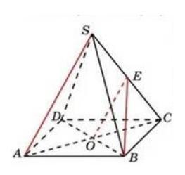 Дано зображення піраміди SABCD. Точка Е – середина SС, точка О – точка перетину діагоналей основи. Яке взаємне розміщення площин (ADS) і (ОЕВ)? Виберіть одну правильну відповідь. а)перетинаються б) паралельні в) збігаються г) перпендикулярні д) визначити неможливо