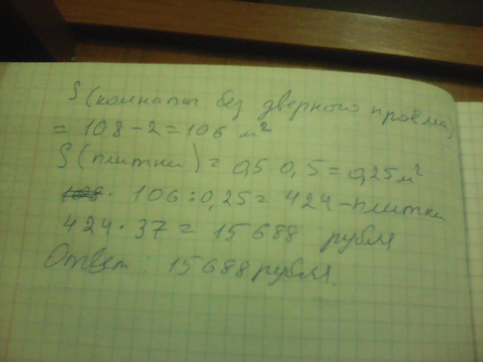 В комнате высотой 3 м и основанием 6 м на 4 м .Кладут плитку на стены, пол, потолок. В одной из стен имеется дверной проем высотой 2 м и шириной 1 м.Размер плитки 50см*50см.Её стоимость 37р. За плитку. Вычислить общую сумму. помогите пожалуйста