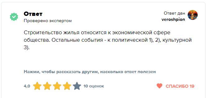 Срочно! Буду благодарна) Что из перечисленного относится преждее всего к экономической сфере общества? 1) Учредитедьный съезд партии. 2) Проведение референдума. 3) Премьера спектакля. 4) Строительство жилья. Объясните зачем вы выбрали свой выбор и напишите другие ответы, которые вы не выбрали к чему они относятся.