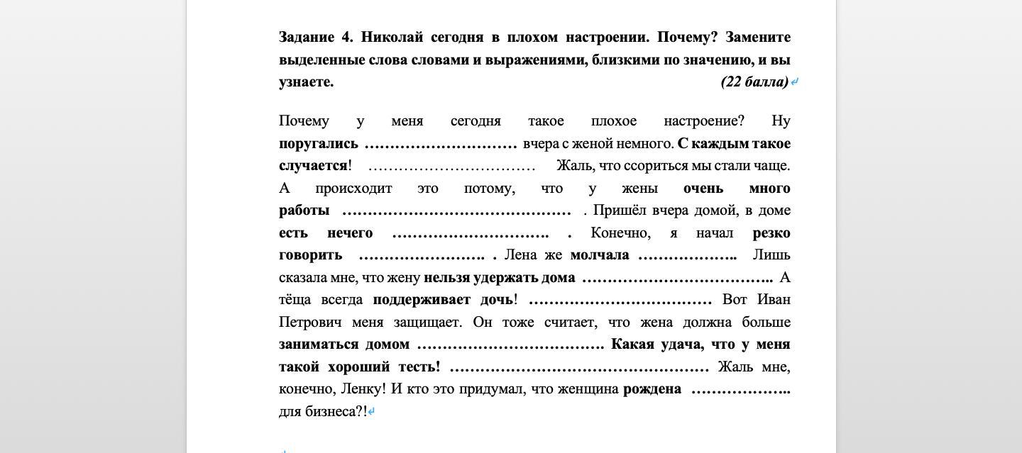 Почему у меня сегодня такое плохое настроение? Ну, поссорились вчера с женой немного. С кем не бывает! Жаль, что ссориться мы стали чаще. А происходит это потому, что у жены хлопот полон рот (дел невпроворот, дел по горло). Пришёл вчера домой, в доме шаром покати. Конечно, я начал горячиться. Лена же словно воды в рот набрала. Лишь сказала мне, что жену к дому не привяжешь. А тёща всегда на стороне дочери! Вот Иван Петрович меня защищает. Он считает, что жена больше уделять внимания дому. Как мне повезло с тестем! Жаль мне конечно, Ленку! И кто это придумал, что женщина создана для бизнеса?!