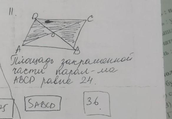 Как известно, диагонали параллелограмма делят его на 4 равных по площади треугольника. Закрашенная часть состоит из трех треугольников, и её площадь равна 24. Значит один треугольник разбиения имеет площадь 24/3 = 8. Но весь параллелограмм ABCD состоит из 4-х треугольников, значит