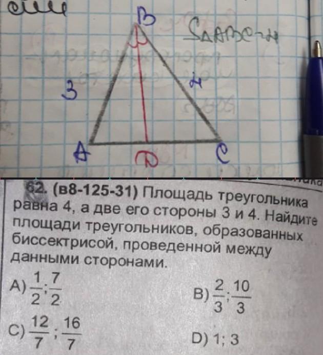 3. Х : (Х - 4) = 3 : 4; 4Х = 12 - 3Х; 4Х+3Х = 12; Х = 12/7. SΔABD = 12/7.