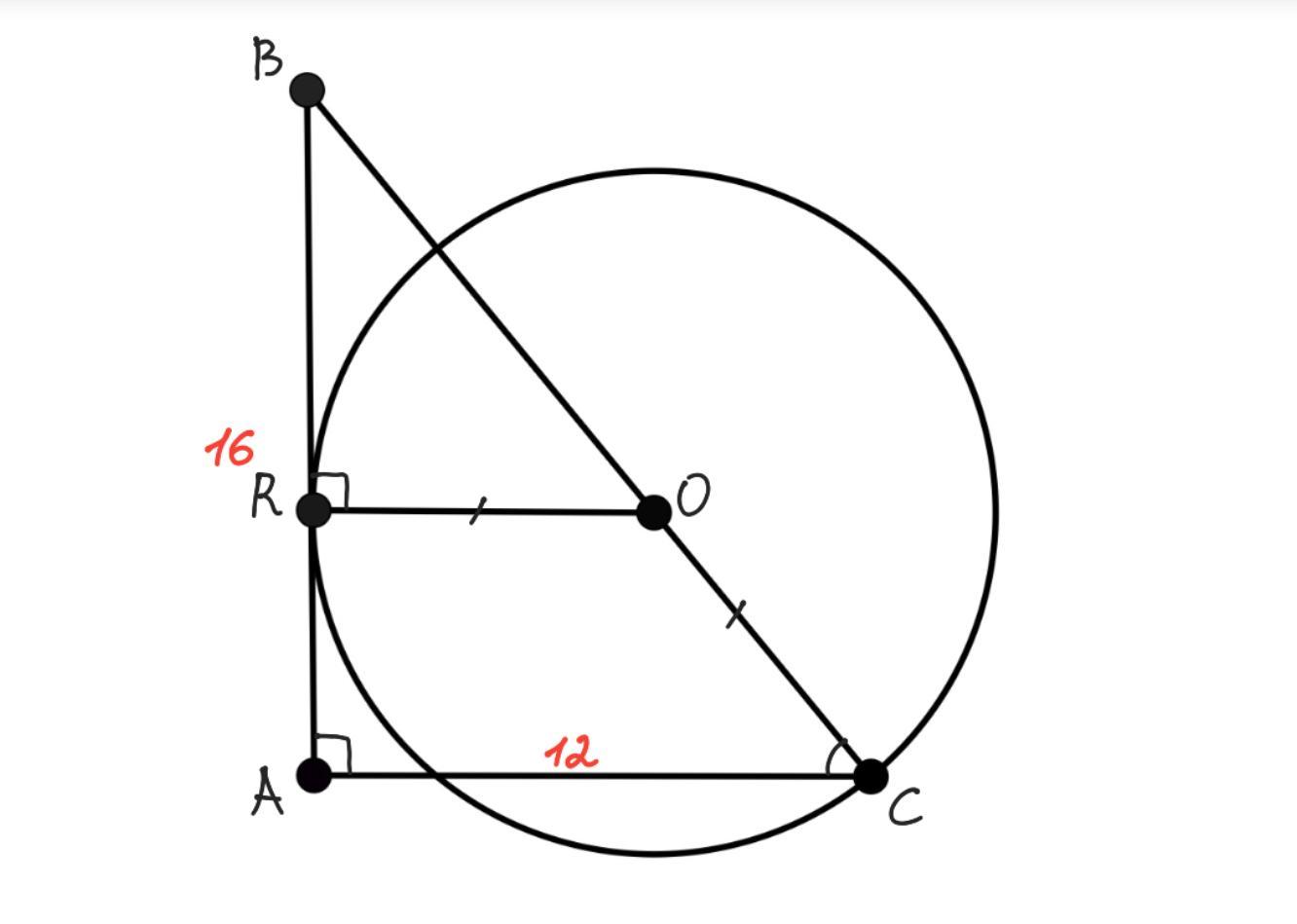 Дано: ΔABC — прямокутний, АВ і АС — катети, АВ=16 см, АС=12 см, коло(R;OC), т.О∈ВС, т.R — точка дотику кола до ΔАВС, т.R∈AB.