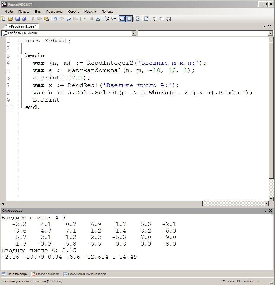 Дана вещественная матрица размерности n на m. Сформировать вектор b, каждый элемент которого вычисляется как произведение элементов меньших заданного А, соответствующего столбца
