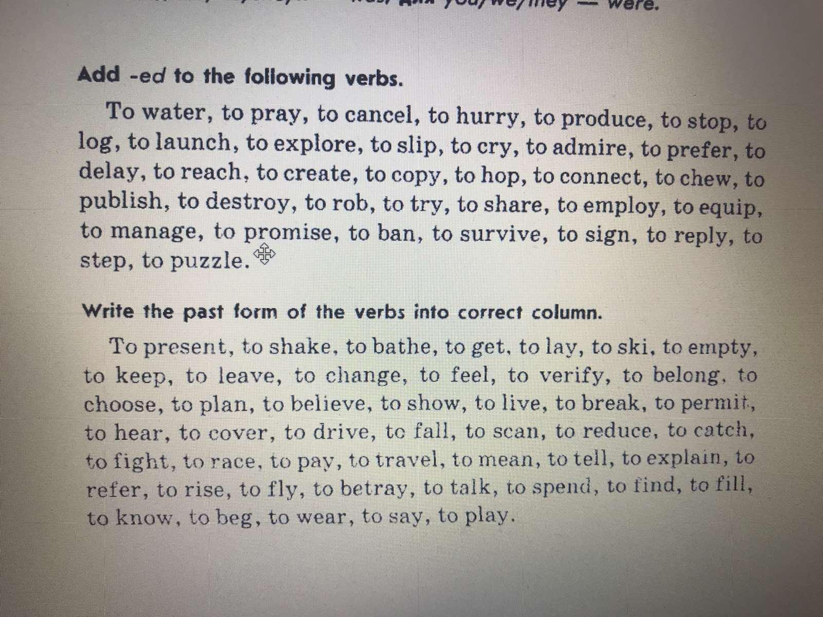 2. presented, shook, bathed, got, laid, skied, emptied, kept, left, changed, felt, verified, belonged, chose, planned, believed, showed, lived, broke, permitted, heard, covered, drove, fell, scanned, reduced, caught, fought, raced, payed, traveled, meant, told, explained, refereed, rose, flew, betrayed, talked, spent, found, filled, knew, begged, wore, said, played