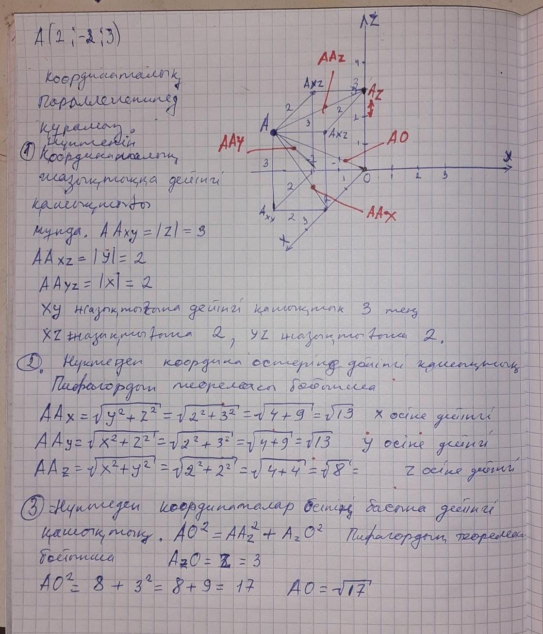 (2;-2;3) нүктесінен:1) координаталық жазықтықтарға; 2) координаталар осьтеріне; 3) координаталар басына дейінгі арақашықтықты табыңдар