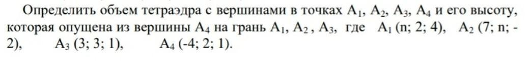 Зная площадь s грани А₁А₂А₃ и объем тетраэдра v можно теперь найти высоту h, опущенную на эту грань из вершины А₄, она равна h=3v/s=