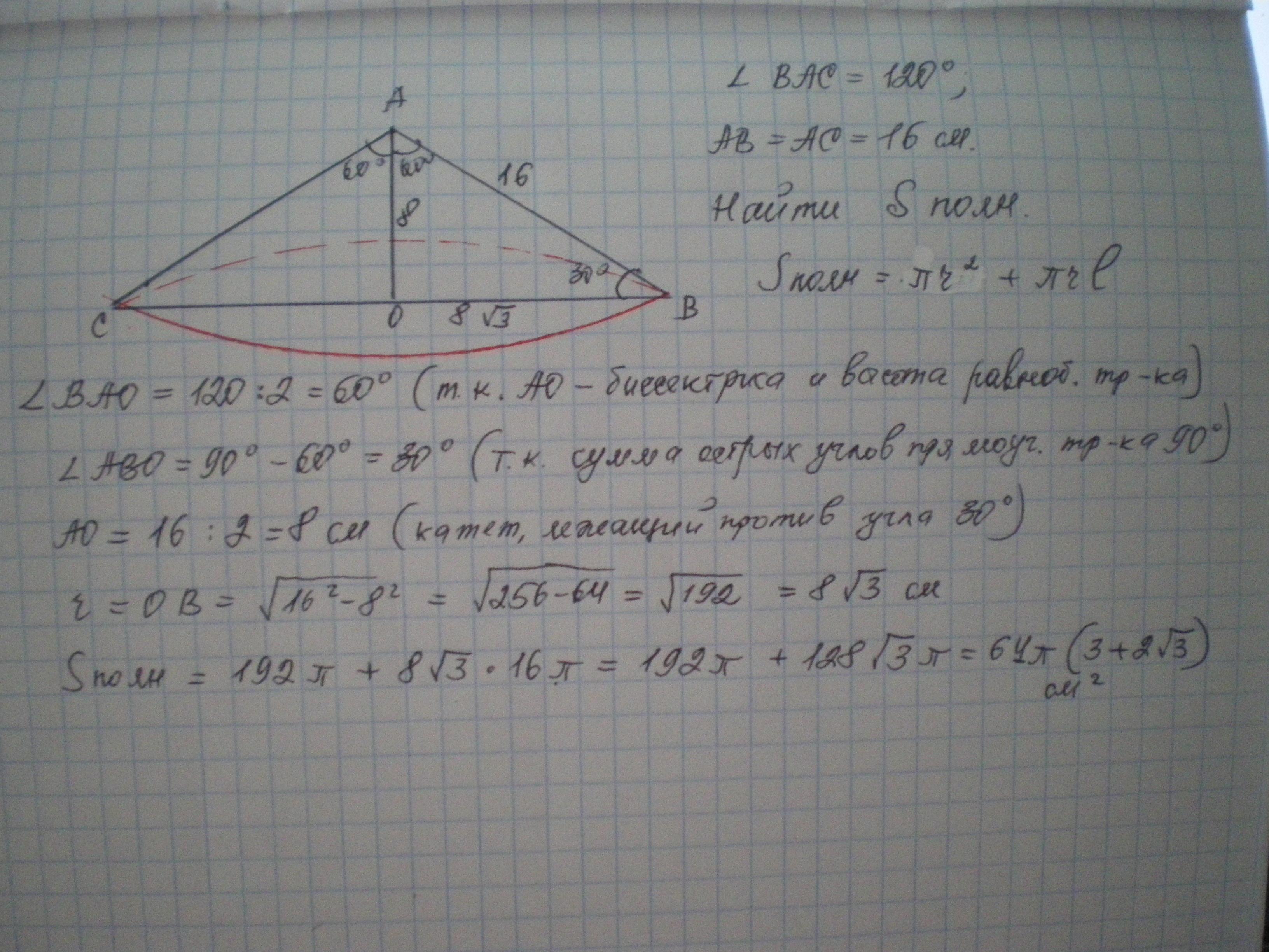 Осевое сечение конуса – равнобедренный треугольник с углом 120° и равными сторонами по 16см. Найдите площадь полной поверхности конуса