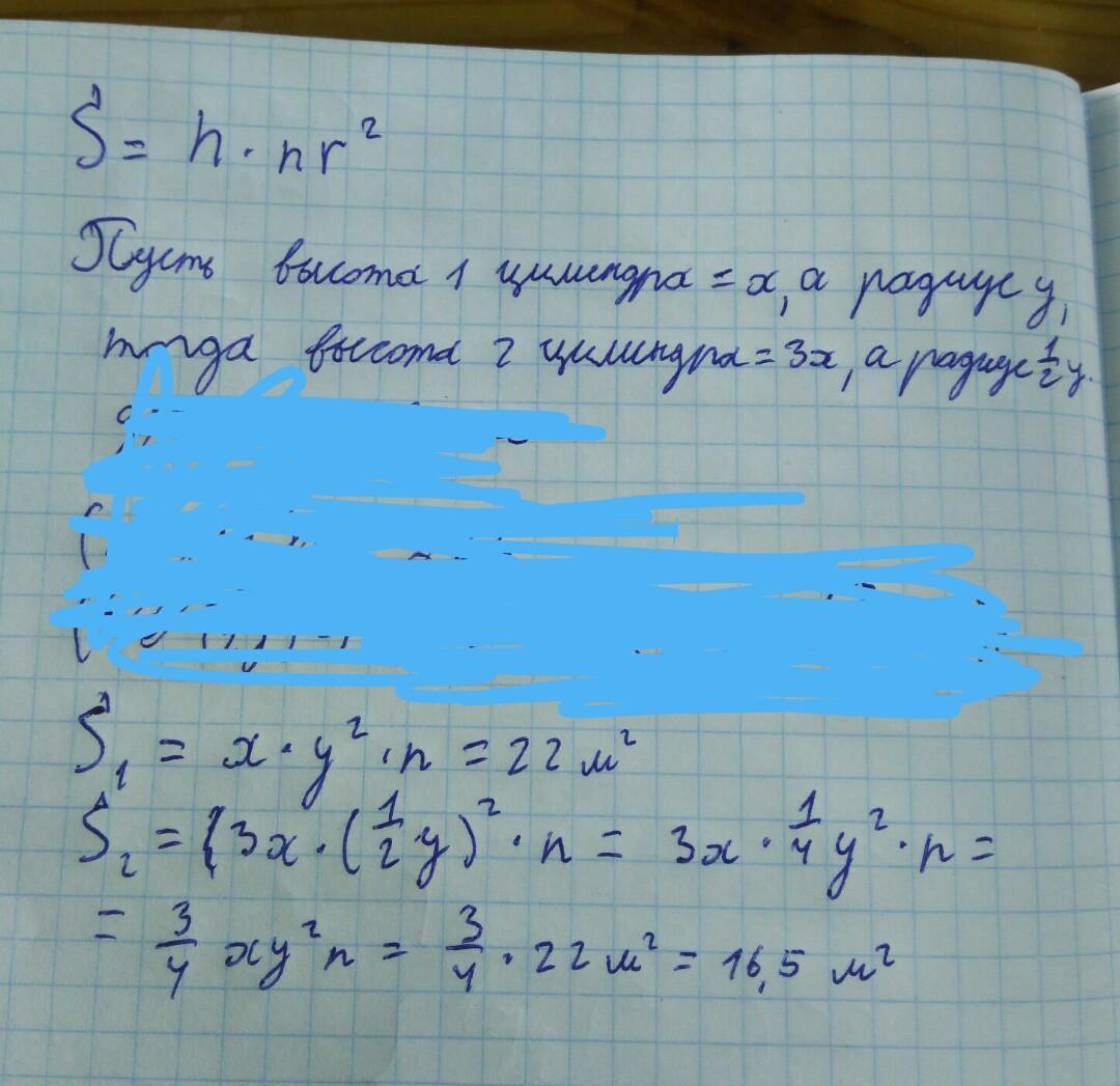 Объем первого цилиндра равен 22 кубическим метрам . У второго цилиндра высота в 3 раза больше, а радиус основания — в 2 раза меньше, чем у первого. Найдите объем второго цилиндра. Ответ дайте в кубических метрах,не записывая единицу измерения в ответ.