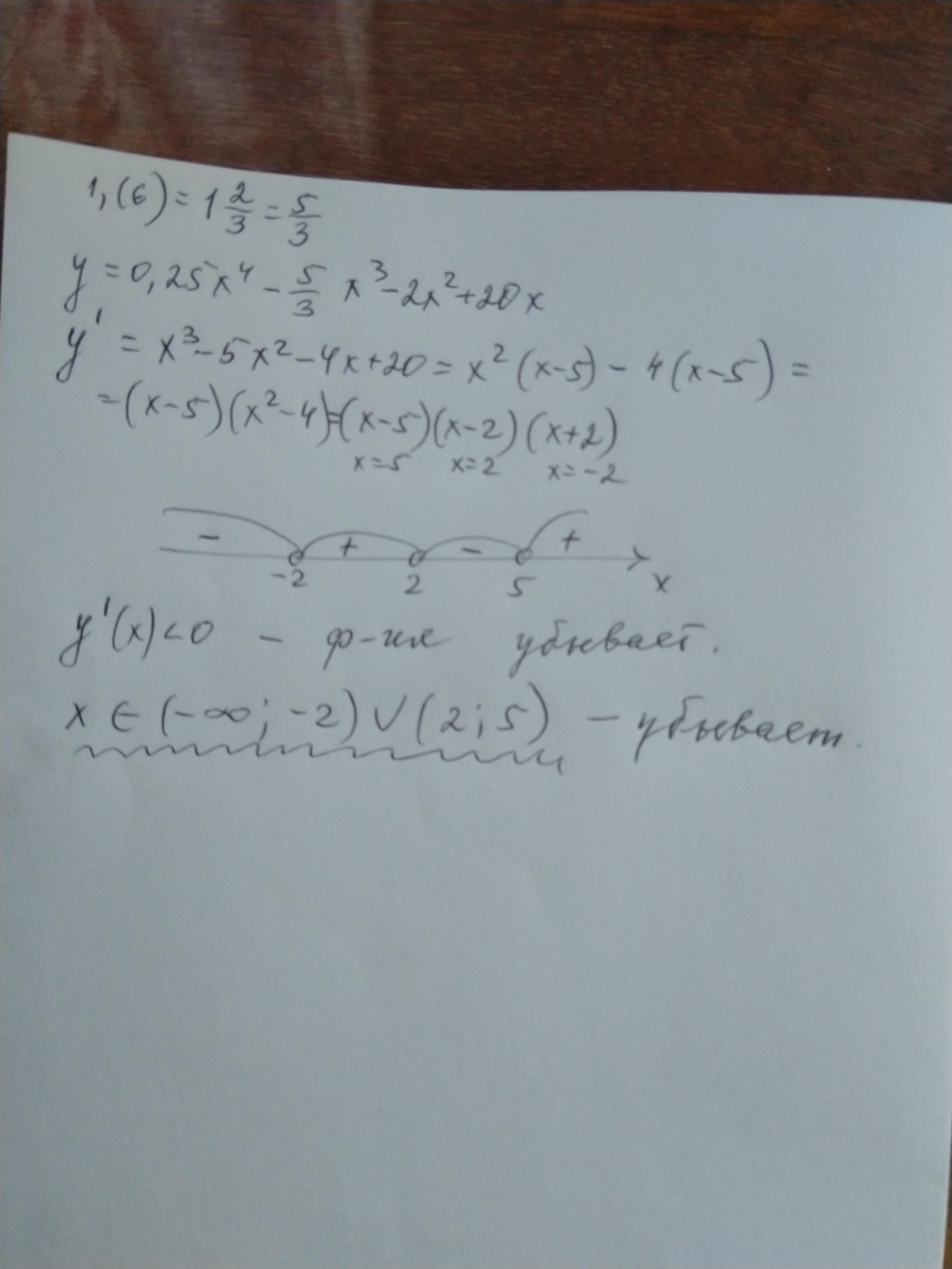 [40б] Найдите промежуток убывания функции y=0,25x^4 -1,(6)x^3-2x^2 +20x