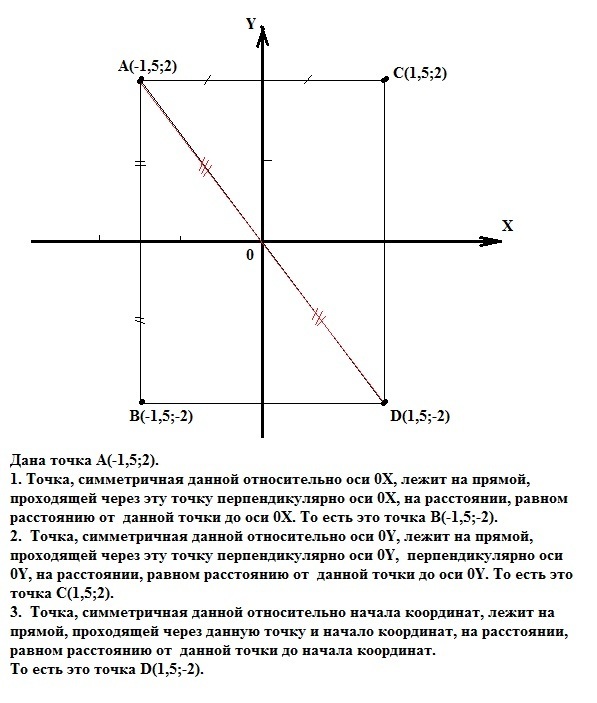а). Точка, симметричная данной относительно оси 0Х, лежит на прямой, проходящей через эту точку перпендикулярно оси 0Х, на расстоянии, равном расстоянию от данной точки до оси 0Х. То есть это точка В(-1,5;-2).