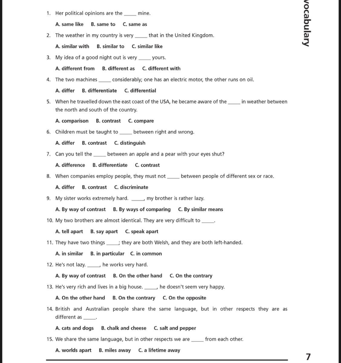 15. We share the same language, but in other respects we are A. worlds apart from each other. A. worlds apart B. miles away C. a lifetime away