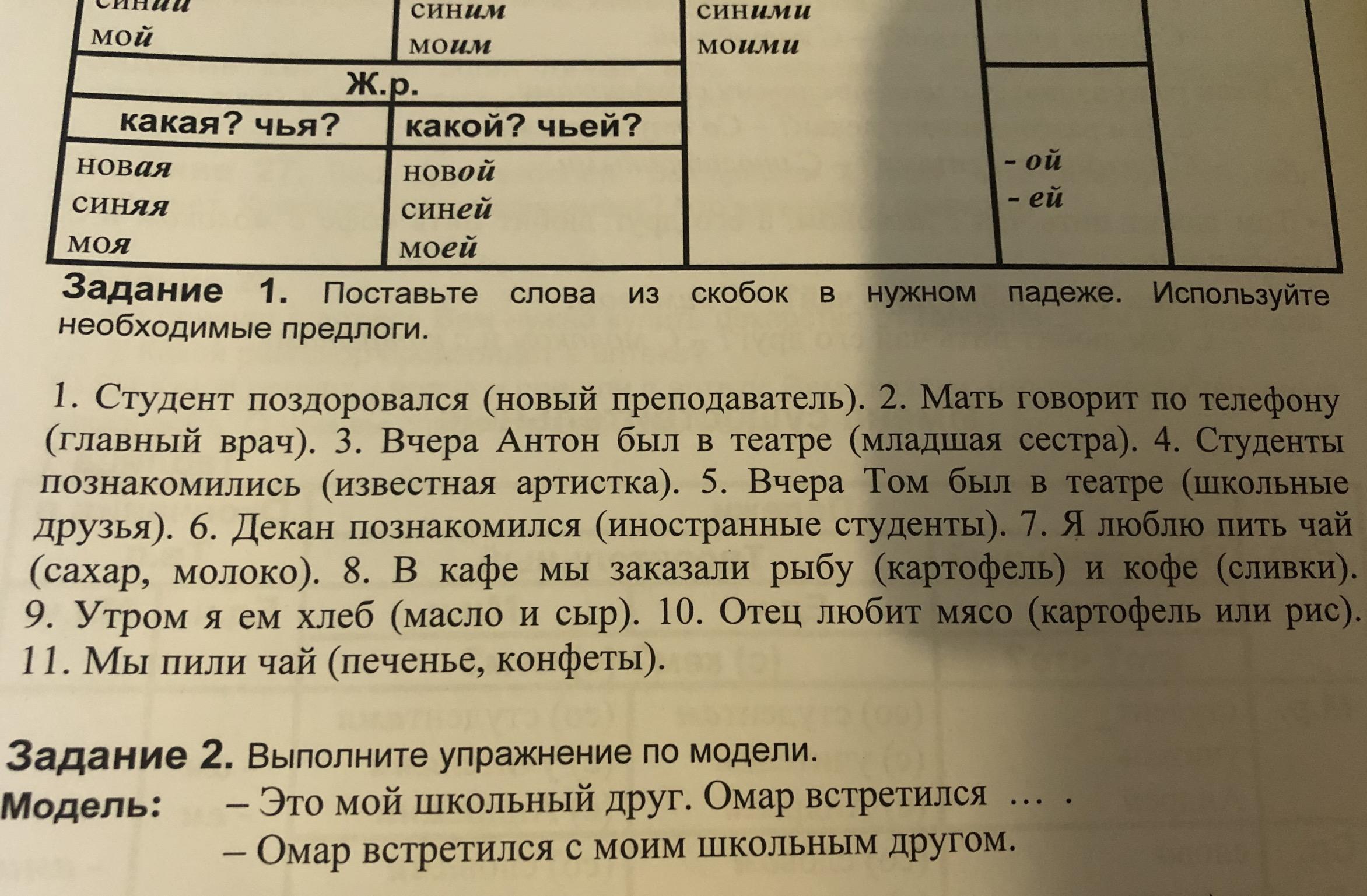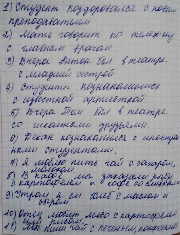 С новым преподавателем. С главным врачом. С младшей сестрой. С известной артисткой. Со школьными друзьями. С иностранными студентами. С сахаром, молоком. С картофелем и кофе со сливками. С маслом и сыром. С картофелем или рисом. С печеньем, конфетами.