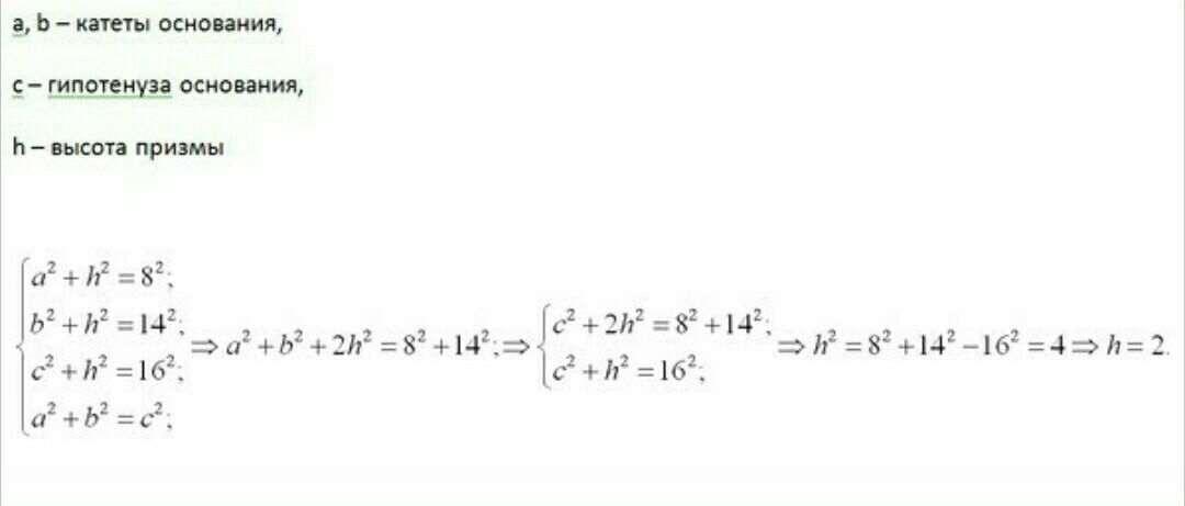 Основание призмы – прямоугольный треугольник, диагонали боковых граней призмы – 8 см, 14 см, 16 см. Найдите высоту призмы.