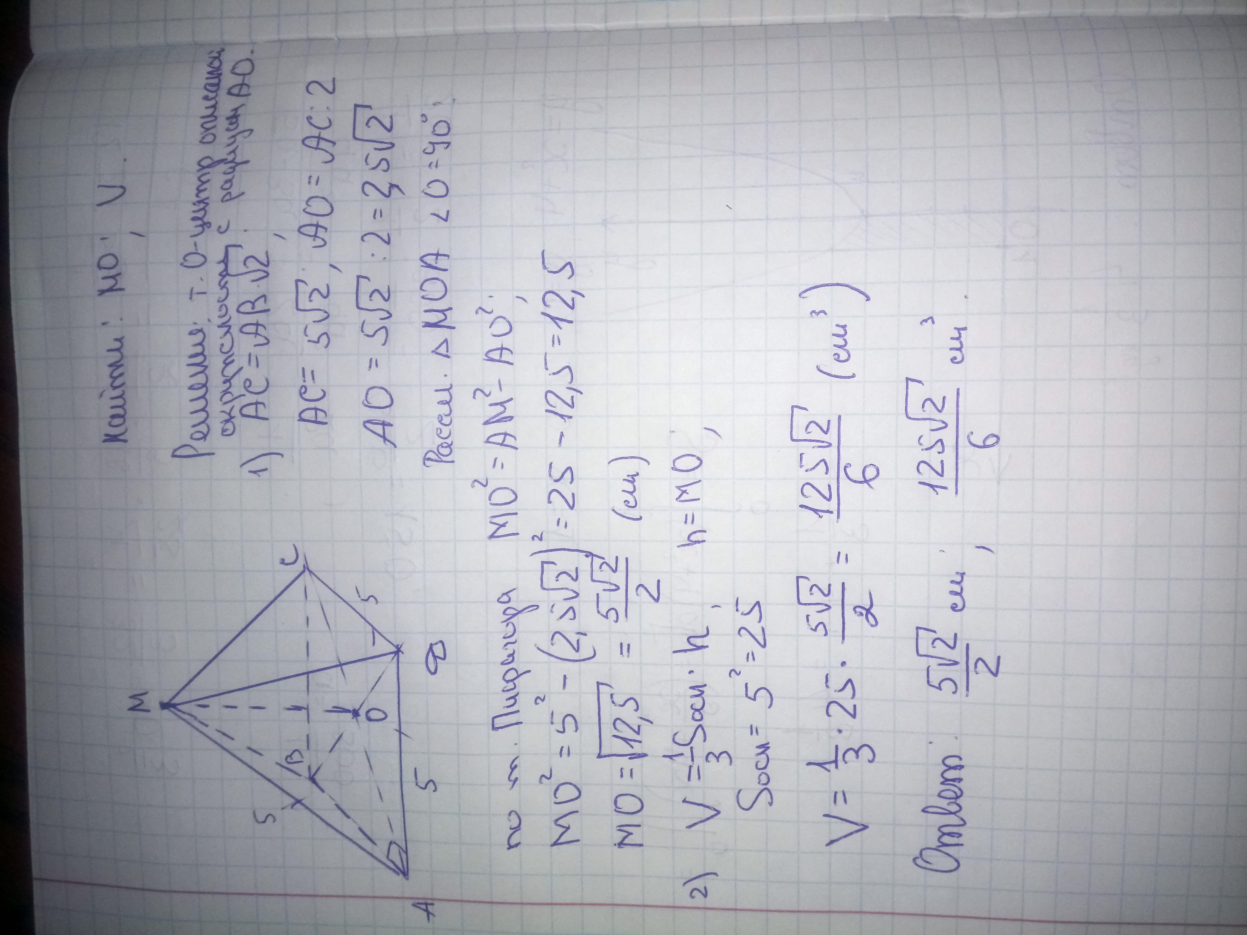 Объем (1/3)*25*2,5*sqrt(2)=625*sqrt(2)/30=sqrt(2)*(20 5/6) см куб