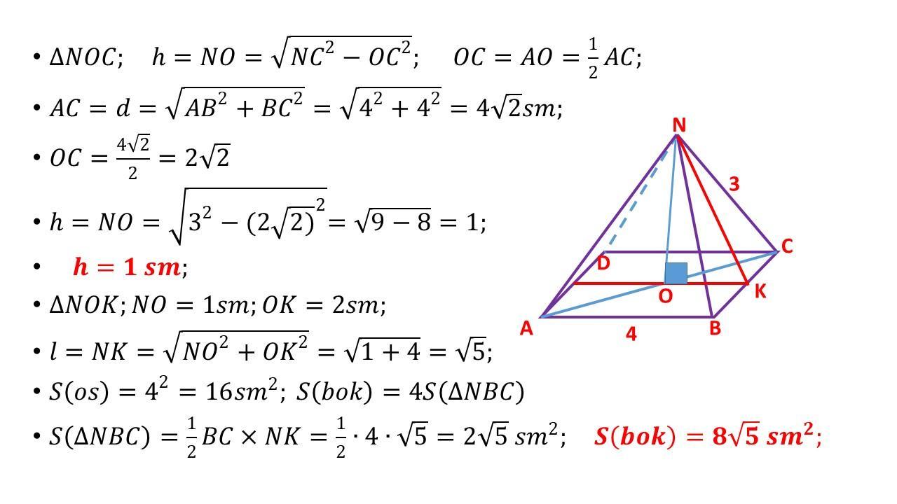 Сторона основания правильной четырёхугольной пирамиды NABCD равна 4см, а каждое из боковых рёбер пирамиды равно 3см. найдите высоту и площадь боковой поверхности пирамиды.