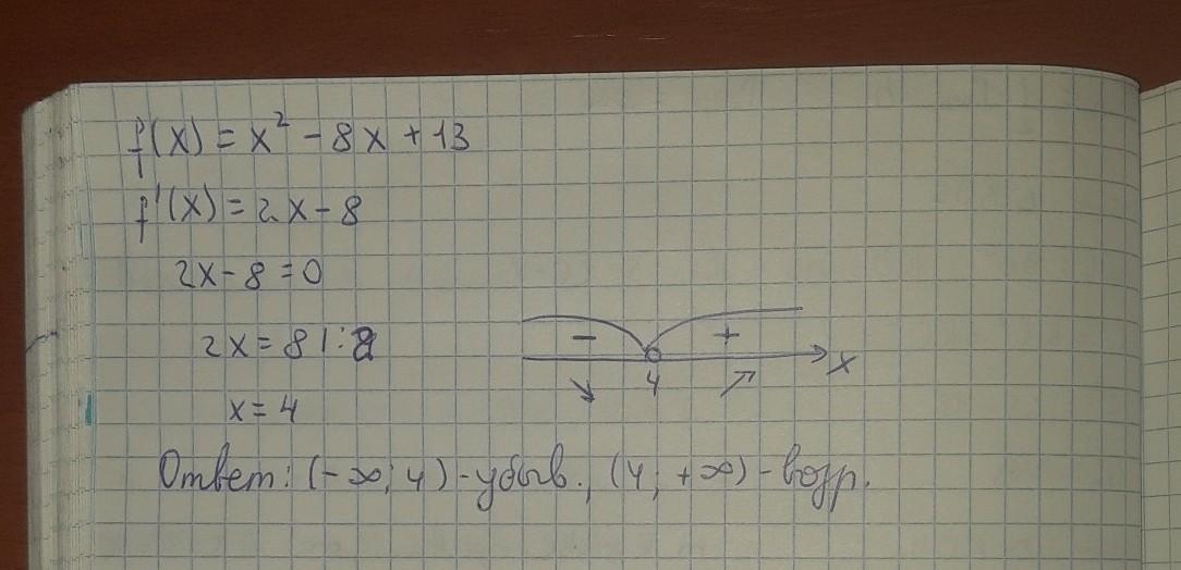 СРОЧНО Найдите промежутки возрастания функции f(x) = x2-8x+13. (Желательно, либо прислать фото решения, либо прислать подробную разборку задания, чтобы я мог переписать)