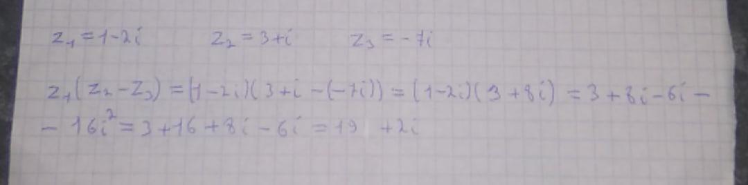 Даны комплексные числа: Z1 = 1-2i, Z2 = 3+i, Z3 = -7i. Вычислите: Z1•(Z2-Z3)? 1.19-2i 2.19+2i 3.19 4.2i