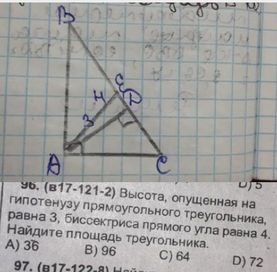 Высота, опущенная на гипотенузу прямоугольного треугольника, равна 3, биссектриса прямого угла равна 4. Найдите площадь треугольника.
