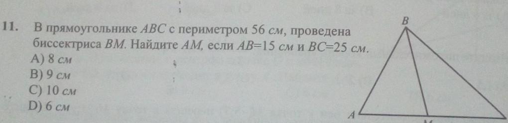 В треугольнике АВС с периметром 56 см , проведена биссектриса ВМ. Найдите АМ, если АВ=15см, ВС=25 см.