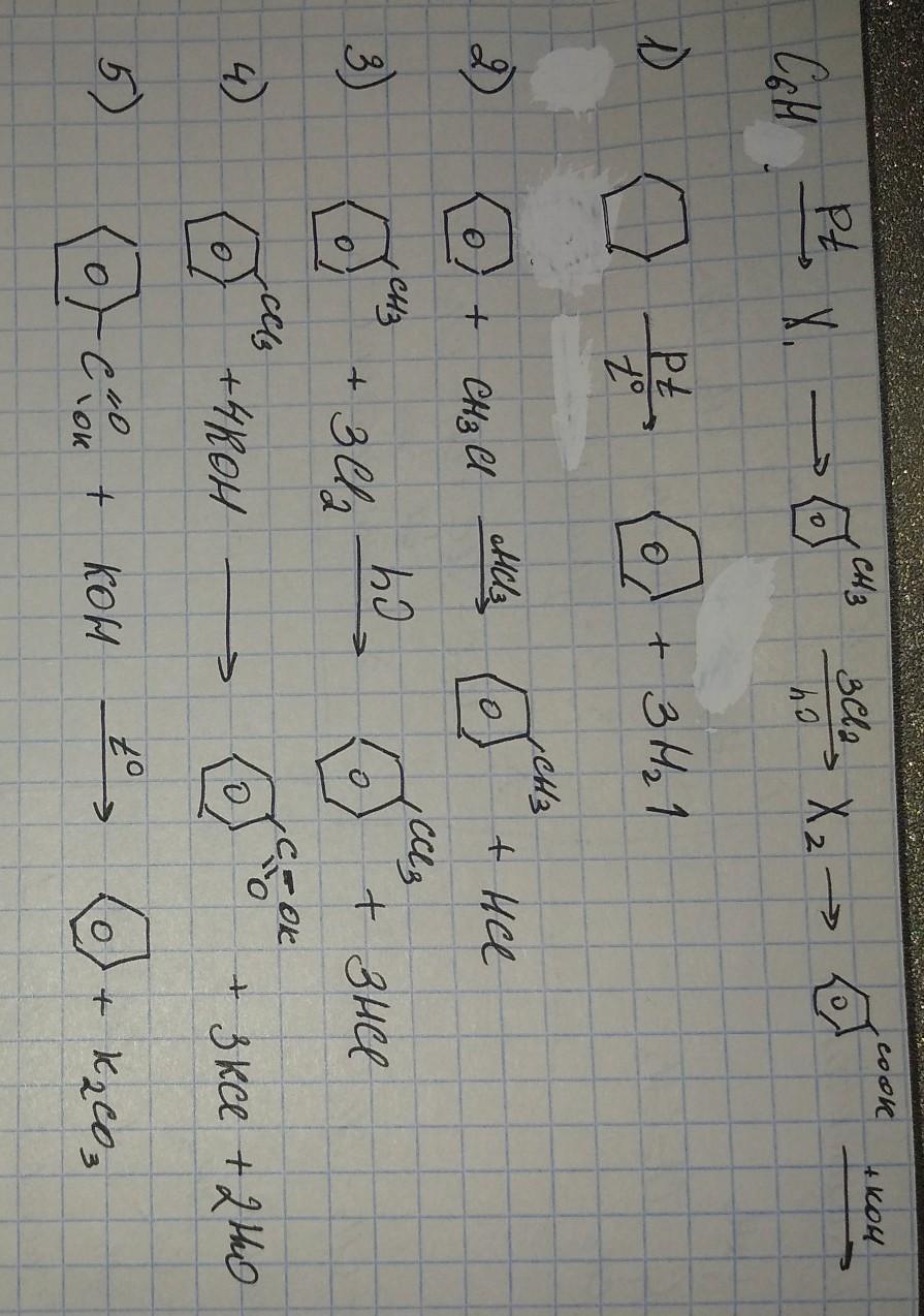 Помогите пожалуйста по химии! Используя структурные формулы, напишите уравнения реакций, с помощью которых можно осуществить следующие превращения C6H12стрелка над ним на вверхуPt стрелкаC6H6CH3стрелка над ним +3Clвнизу2 стрелка 2 стрелка над ним +KOHстрелкаC6H6COOKстрелка над ним +KOH стрелка X3