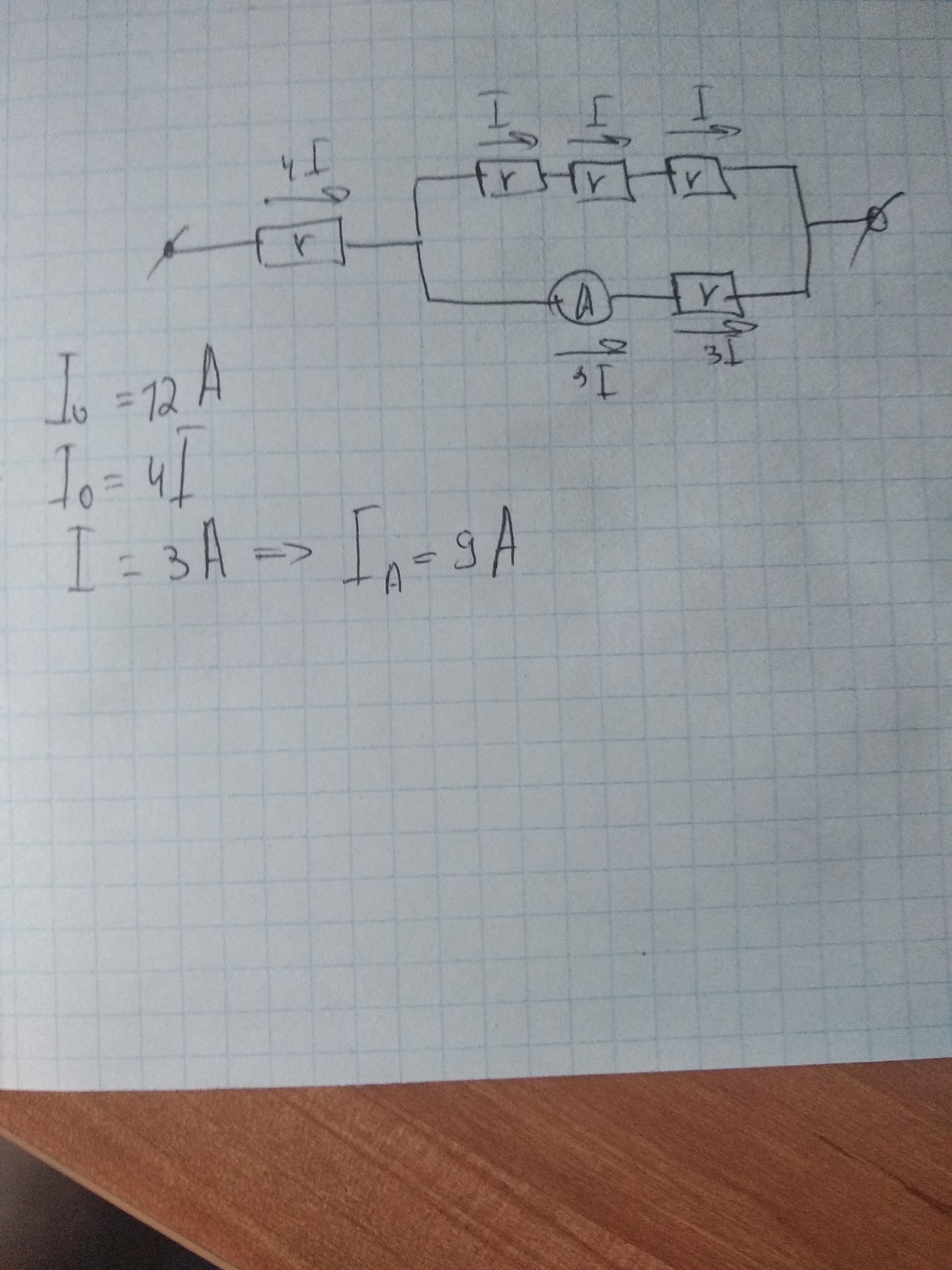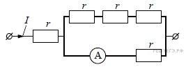 . По участку цепи (см. рисунок) течёт постоянный ток I = 12 А. Какую силу тока показывает амперметр, если сопротивление r = 1 Ом? Сопротивлением амперметра пренебречь.